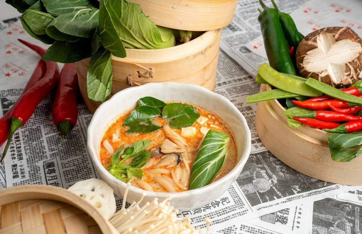 Суп на кокосовом молоке с грибами эноки и лапшой удон