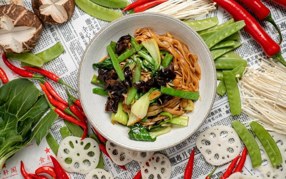 Плоская рисовая лапша с овощами