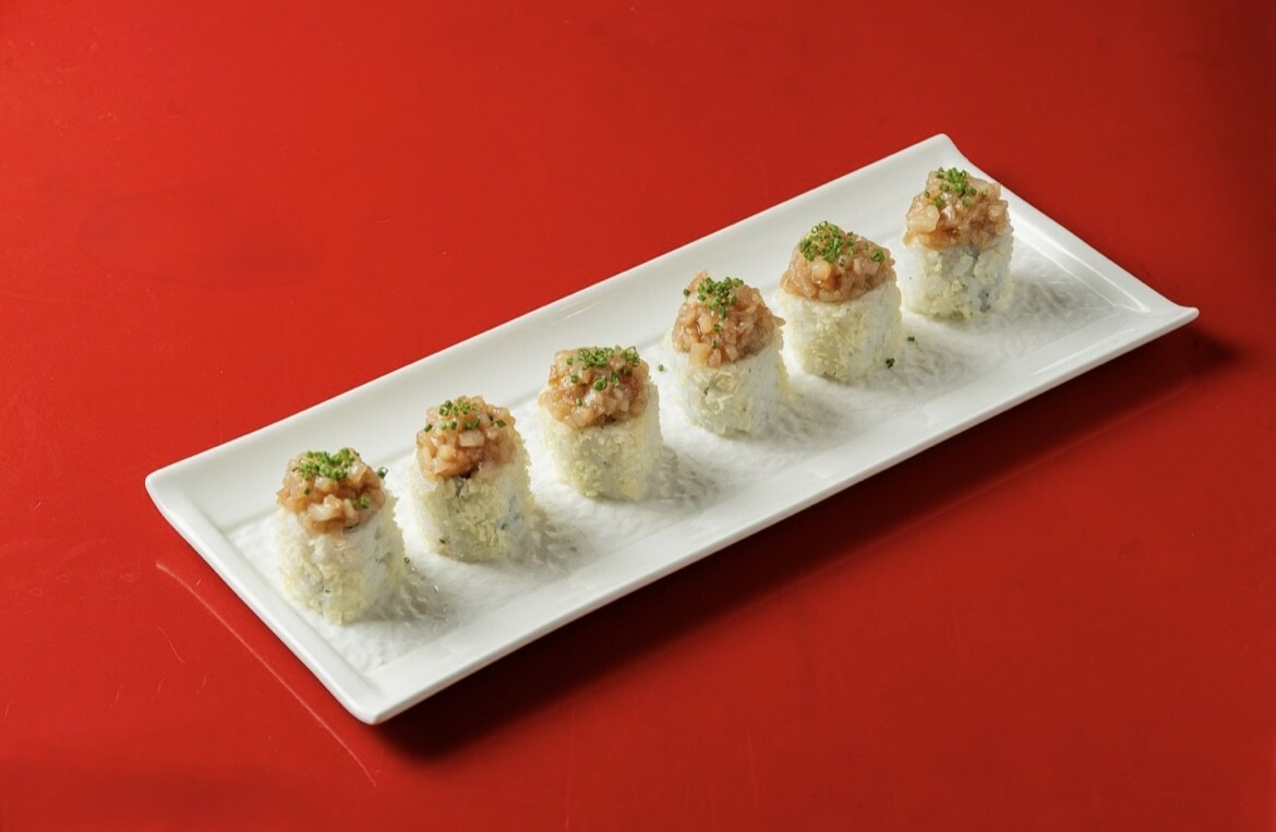 Крабовый фарш (краб, апельсины, икра тобико), соус гункан(майонез японский, паста самбал, сахарная пудра, соус мирин), рис для суши(рис, соус(сахар, уксус рисовый, водоросль комбо, соль), икра тобико, томаго, авокадо, водоросли нори