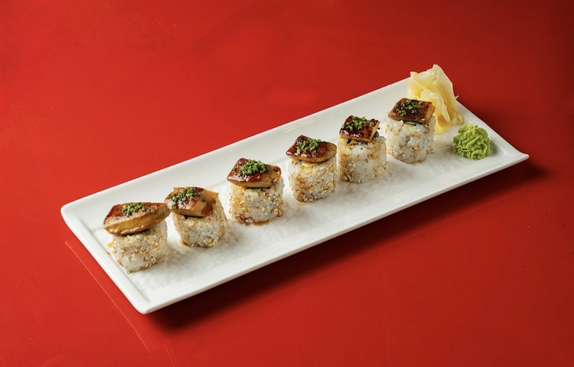 Рис для суши(рис, соус(сахар, уксус рисовый, водоросль комбо, соль), угорь копченный, икра тобико, краб, сыр мягкий, томаго, авокадо, соус угорь(соус соевый, соус рисовый, угорь копченый, сахар, сакэ),водоросли нори, кунжут