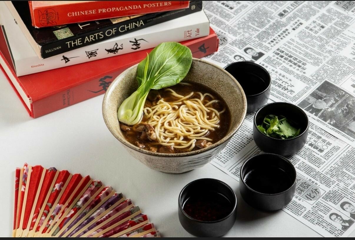 Смесь бульонов (первый - свиные кости, рулька свиная, куры, лук порей, лапки куриные, корень имбиря; второй - лук порей, корень имбиря, сахар, соус соевый темный, соус соевый светлый, устричный соус, сельдерей стебель, порошок куриный, специи в ассорт, соль, морковь, лук репчатый), утка маринованная (утка, лук порей, соль, кинза, корень пайчжы сушеный, корень имбиря, корень лакрицы сушеный, орех цау-хуа, фенхель, специи в ассорт, перец сычуанский), лапша соевая, салат пак чой, яйцо куриное, масло кунжутное