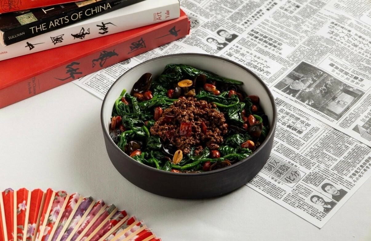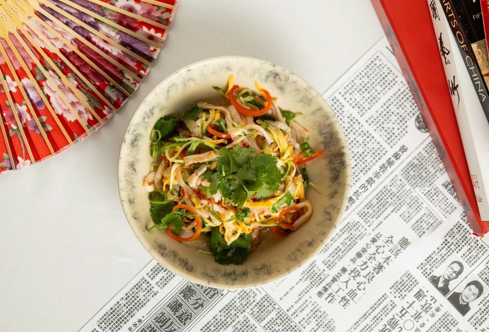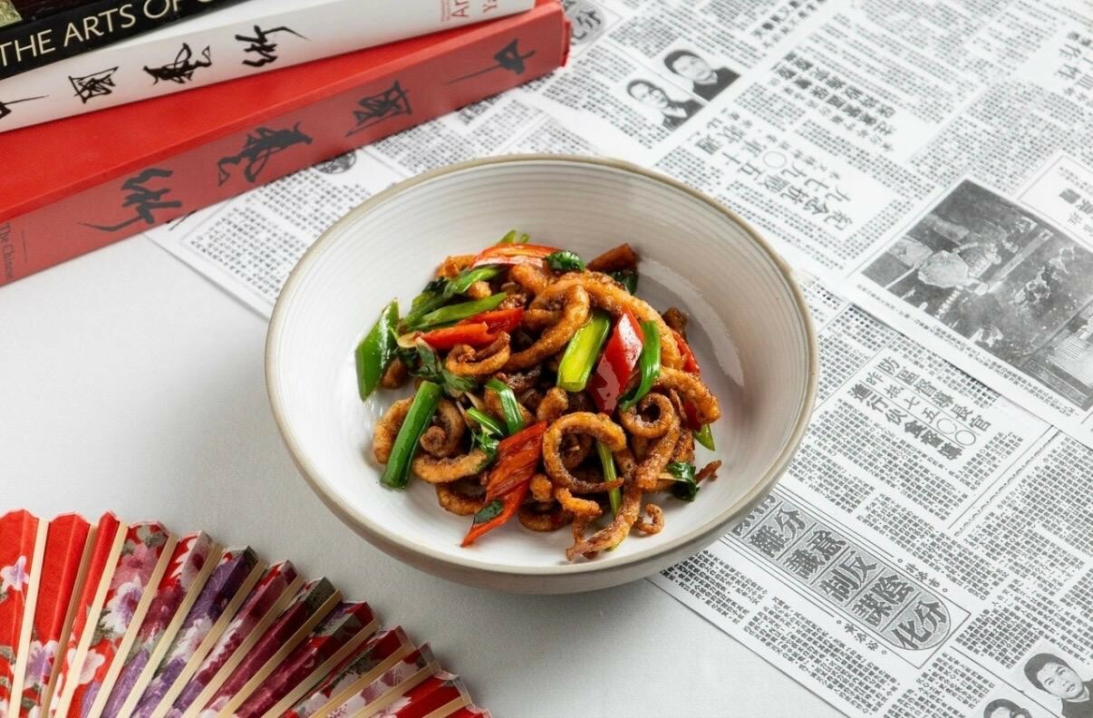 Салат китайский, маринованные осьминоги, грибы черные древесные, заправляются соусом (Соус Хойсин, сахар, чеснок, корень имбиря, специи, лук репчатый, крахмал картофельный), соус Донгу, масло кунжутное, острое масло (масло растительное, перец чили, масло кунжутное, чеснок, соус чили биен)