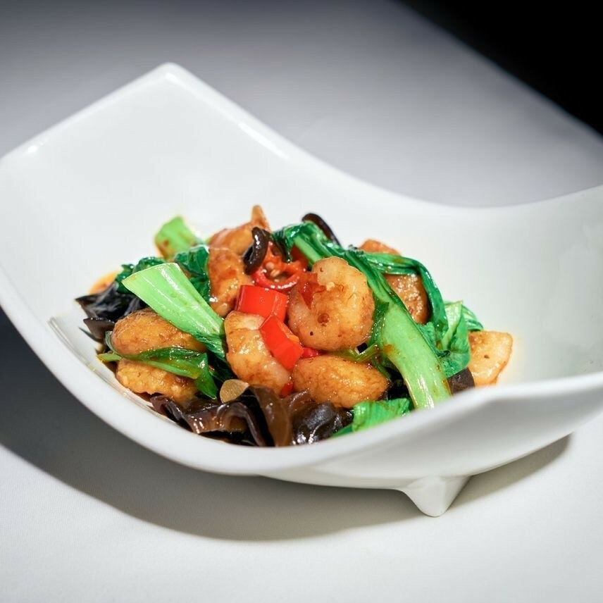 Морской гребешок, лук зеленый, салата Бок-чой, грибы черные древесные, чеснок, приправа Санву, соус Чили биен, китайское вино, соус Донгу, перец чили, корень имбиря, устричный соус, масло кунжутное, сухой гребешок, сахар, специи, перец молотый белый, темный соевый соус